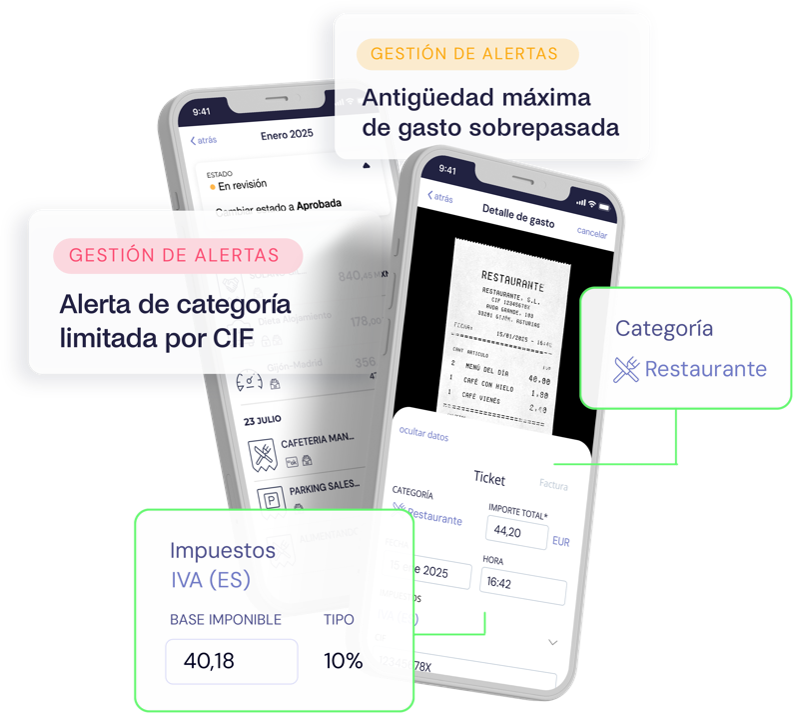 - Detección de gastos fuera de política. Genera alertas o bloquea automáticamente gastos no permitidos (como tickets con alcohol).